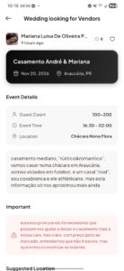 Você publica o seu casamento, e os fornecedores interessados se conectam com você.