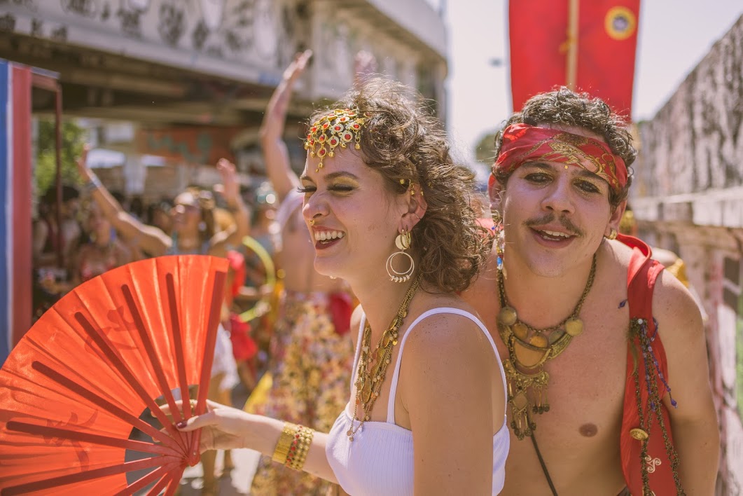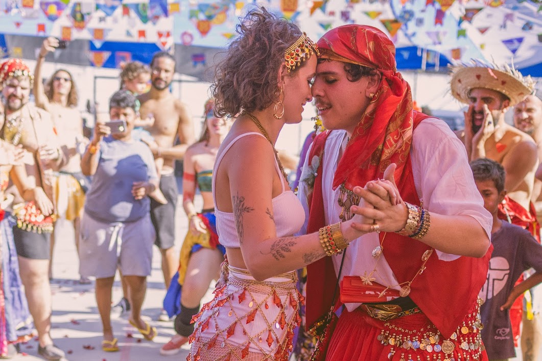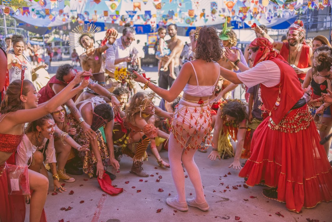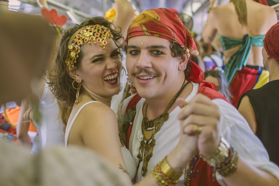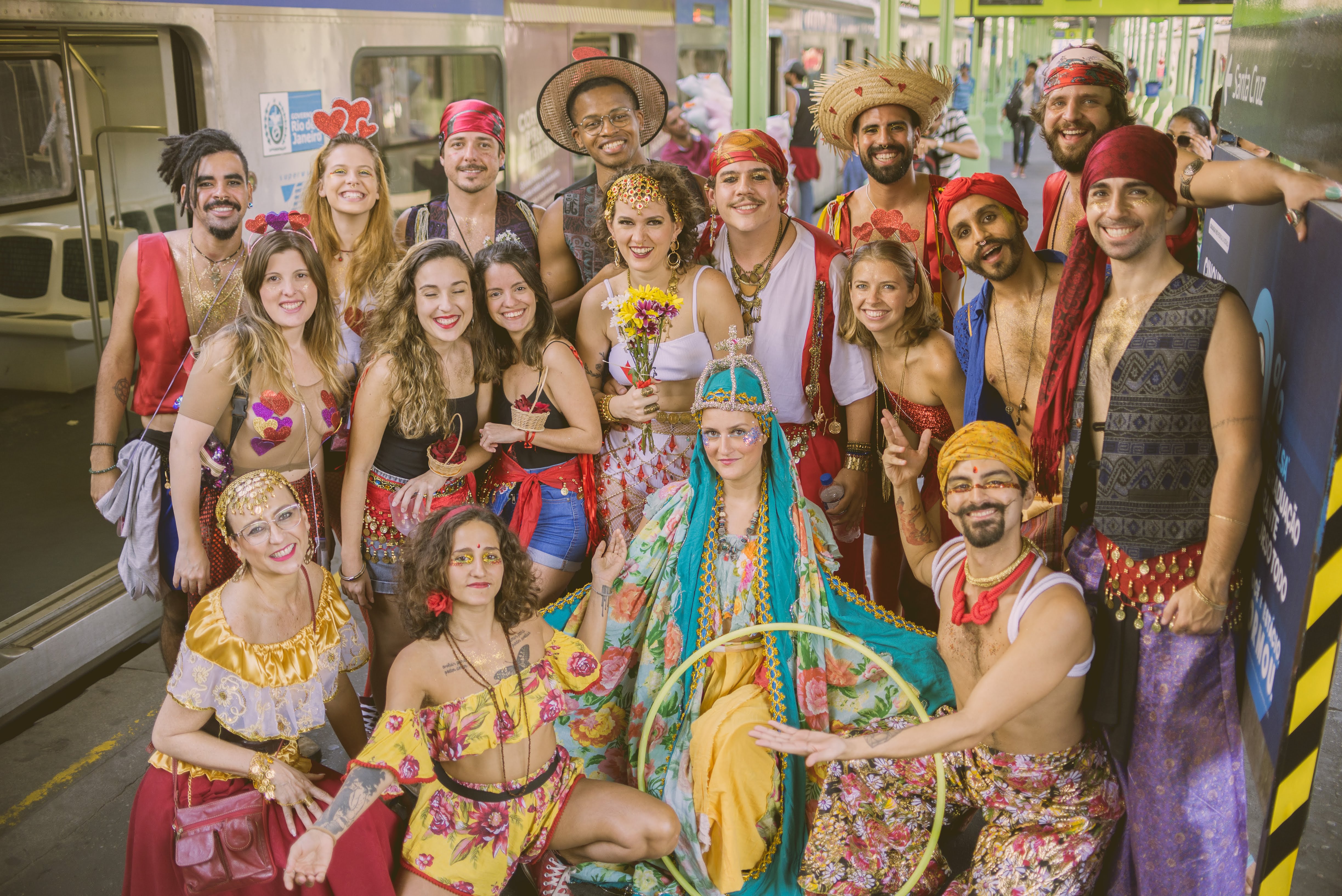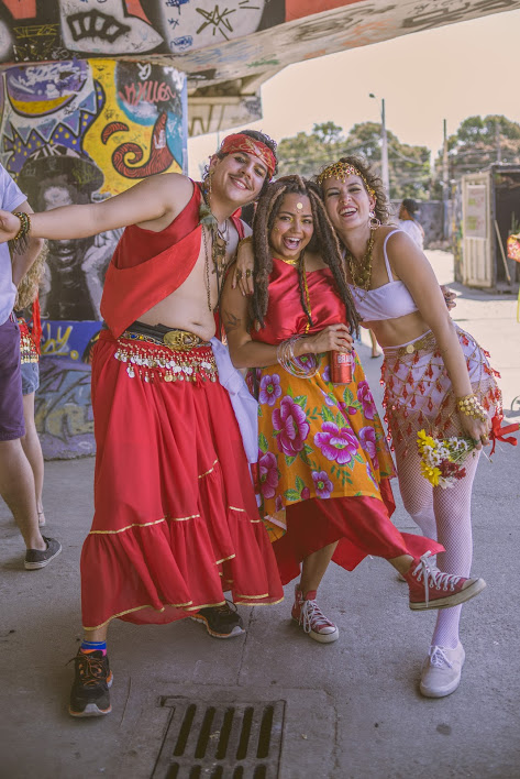 A festa, em clima de folia momesca, aconteceu toda na temática do bloco, que tem uma vibe mística. Não faltaram fantasias criativas, confetes, purpurina e, é claro, muita música. Teve ainda um celebrante vestido de padre. “O Chris foi todo de cigano e eu queria fazer algo mais elaborado. Pensei em usar algo branco, para representar a paz, e queria usar as cores do bloco. Pensando nisso, contratei uma costureira para me ajudar a fazer uma roupa especial, com correntes, e tudo mais”.