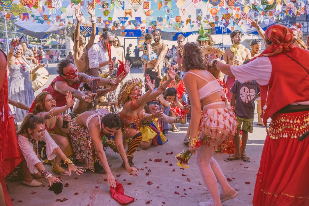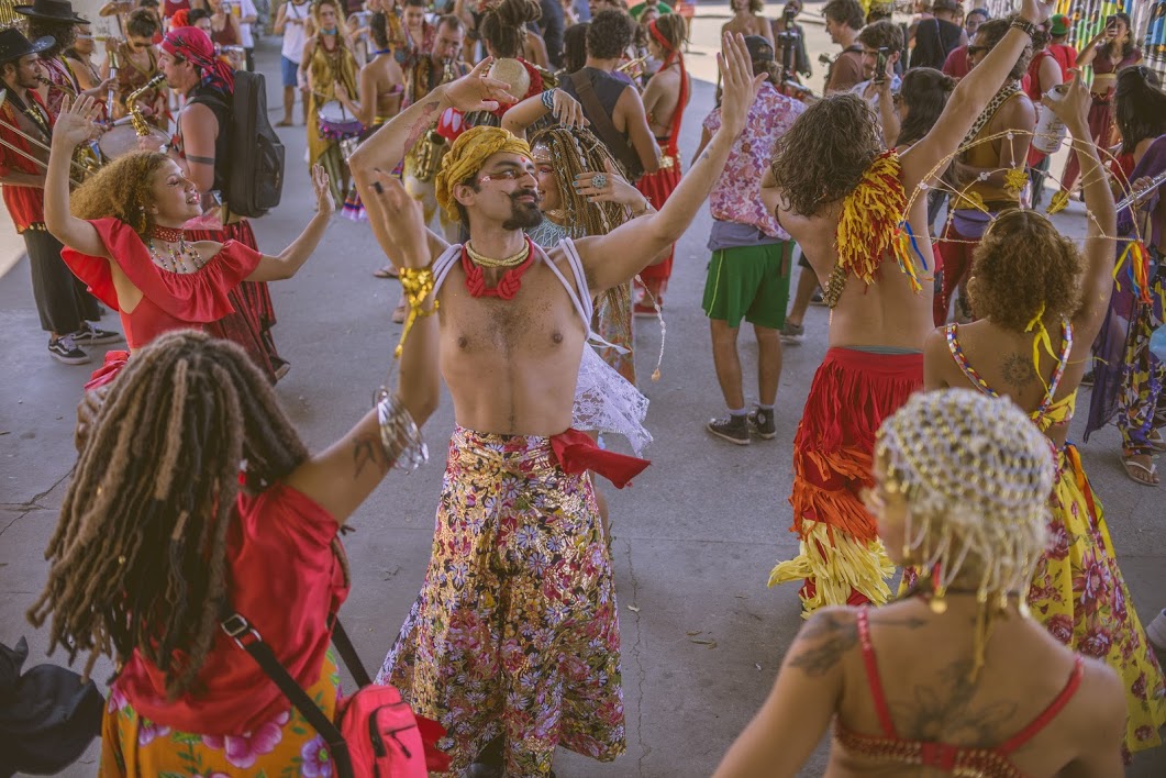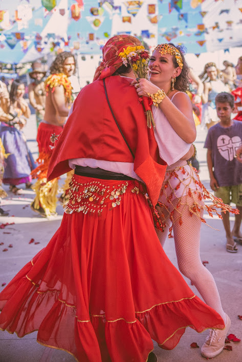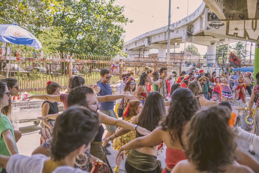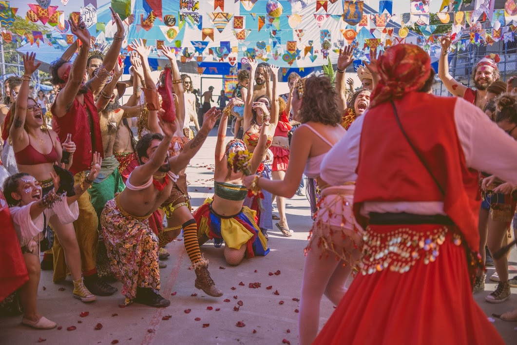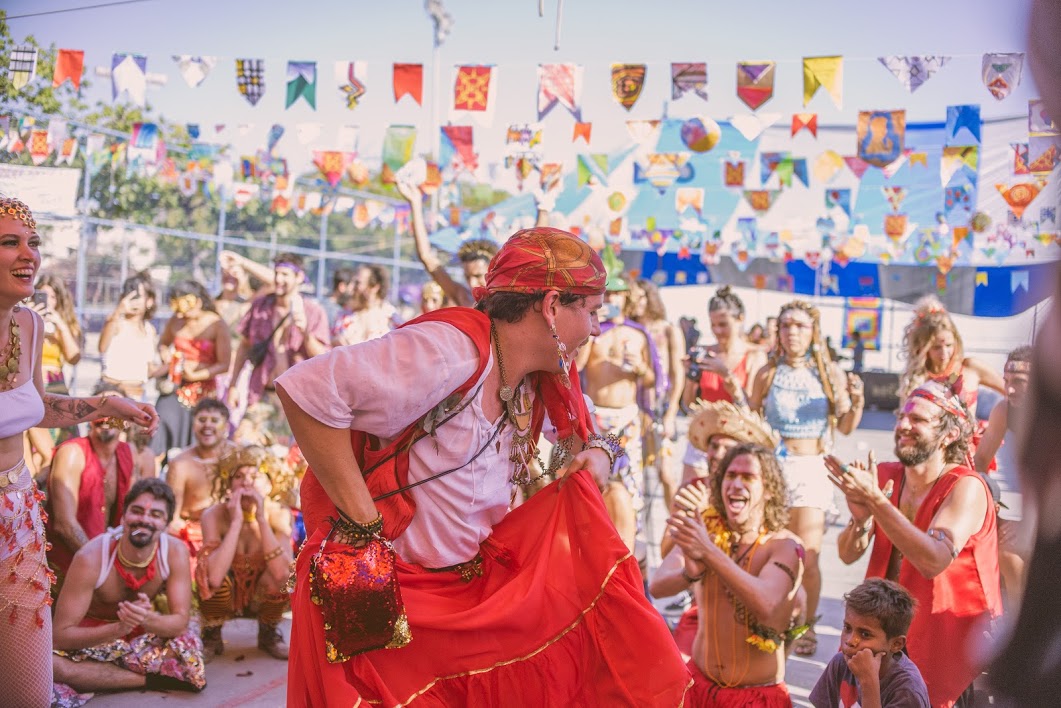 A festa, em clima de folia momesca, aconteceu toda na temática do bloco, que tem uma vibe mística. Não faltaram fantasias criativas, confetes, purpurina e, é claro, muita música. Teve ainda um celebrante vestido de padre. “O Chris foi todo de cigano e eu queria fazer algo mais elaborado. Pensei em usar algo branco, para representar a paz, e queria usar as cores do bloco. Pensando nisso, contratei uma costureira para me ajudar a fazer uma roupa especial, com correntes, e tudo mais”.