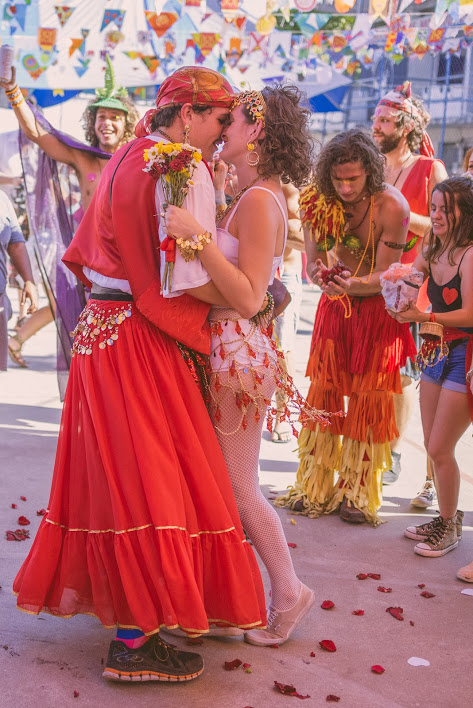 Juntos há cerca de um ano e oito meses, Lari e Chris celebraram a união em clima carnavalesco, no dia 31 de agosto de 2019. Afinal, para eles, Carnaval é sinônimo de amor e diversão – e pode acontecer em qualquer época do ano. O casamento aconteceu no mesmo bloco Charanga Talismã e teve concentração na Estação de Trem e cortejo indo até a Praça da Capelinha, no Realengo. Foi nessa Praça, inclusive, que aconteceu a ‘cerimônia’ nada convencional.