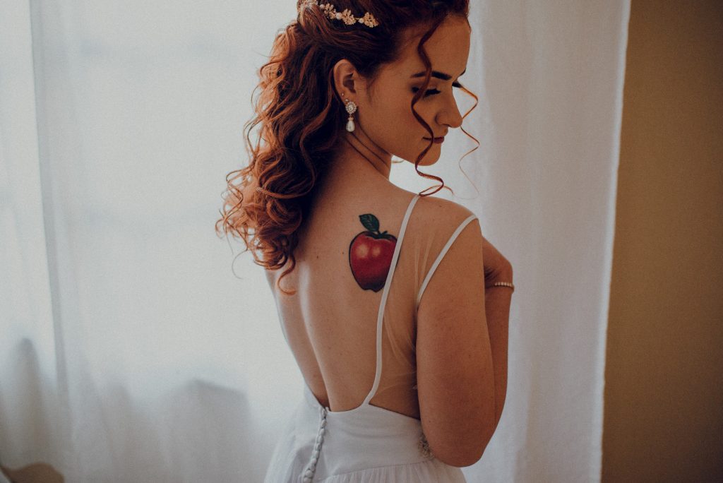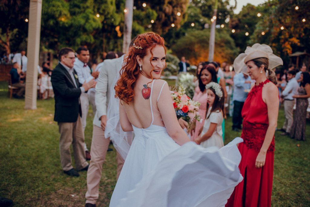 A noiva também estava impecável! Isabela escolheu um modelo bem delicado para o vestido, mas com detalhes marcantes. Nas costas, o decote permitia que sua tatuagem ficasse em evidência. Na maquiagem, ela ousou e optou por um batom escuro. Ficou ainda mais linda!