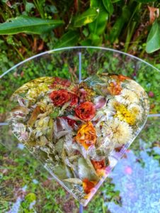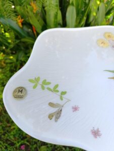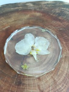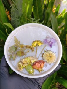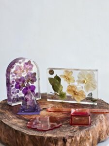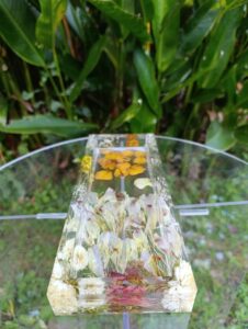 A técnica consiste em incorporar as flores do buquê dentro de peças de resina cristalina, que reproduzem com perfeição as cores e formas originais. A base em madeira nobre traz um toque natural e sofisticado, tornando cada criação uma verdadeira joia decorativa.