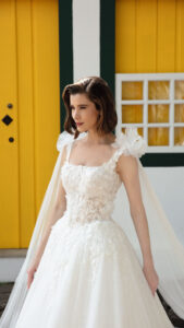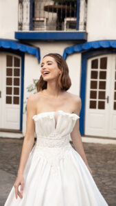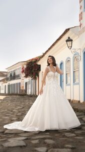 Inspirada na esperança como sentimento transformador, a Speranza traz vestidos rodados ideais para grandes cerimônias em catedrais, confeccionados com tecidos diferenciados como gazar, acqua, piquê e telas com brilho desenhado.