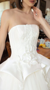 Entre os destaques da coleção estão os espartilhos e a silhueta de corpo baixo, que remetem à era vitoriana, presentes nos modelos românticos. Laços em diferentes tamanhos, texturas e posições oferecem um visual sublime e elegante. Flores em 3D e pérolas traduzem o estilo contemporâneo sofisticado, enquanto plissados e rendas expressam romantismo e delicadeza. Drapeados e majestosos pepluns revelam uma atmosfera poética e refinada, com referências históricas que olham para o passado de forma cativante. A silhueta minimalista permanece em alta, agora com uma visão um pouco mais dramática, trazendo charme e ousadia à estação.
