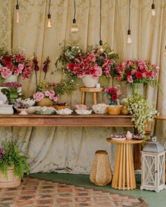 As flores são protagonistas nas produções de Talita Pinheiro. Mas aqui, o diferencial está na forma como elas são utilizadas: nada rígido ou engessado.
